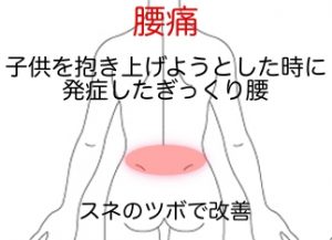 前日に育児の最中、子供をおんぶしたまま物を取ろうとした瞬間に「ビキッ」となり、腰全体に激痛が走った。その日は湿布を貼って様子を見たが、翌日になっても痛みが強く生活がままならないので、以前鍼で腰痛が良くなった経験があり、往診出来る鍼灸がないかネットで調べ、当院を見つけ問い合わせをし、往診依頼をした。